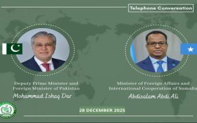 اسلام آباد (اردو ٹائمز) پاکستان نے صومالیہ کی خود مختاری اور علاقائی سالمیت کی مکمل حمایت کا اعادہ کیا ہے۔ترجمان دفتر خارجہ کے مطابق نائب وزیراعظم و وزیر خارجہ اسحاق ڈار کا صومالیہ کے وزیر خارجہ عبدالسلام سے ٹیلیفونک رابطہ ہوا ہے۔ اسحاق ڈار نے صومالیہ کی خودمختاری اور علاقائی سالمیت کے لیے پاکستان کی […]