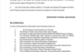 راولپنڈی محکمہ سکول ایجوکیشن پنجاب 31 جنوری 2024ء تک پنجاب کے اسکولوں کے کھلنے کے اوقات کار صبح ساڑھے 9 بجے ہونگے، نوٹیفیکیشن یکم فروری 2024ء سے اسکول ریگولر ٹائمننگ پر کھلیں گے، نوٹیفیکیشن پنجاب حکومت نے تمام پرائیویٹ اور سرکاری اسکولوں کو پابند کردیا
