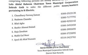 Karachi (Report: Pirbux Noonari) Karachi Chairman Town Municipal Corporation Sohrab Goth, Lala Abdul Rahim, has formed a committee to address various public issues related to K-Electric promptly. An official notification has been issued by the Office of the Chairman, Town Municipal Corporation Sohrab Goth, District East Karachi, in this regard. According to the issued notification, […]