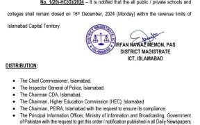 اسلام آباد کی حدود میں تمام سرکاری و نجی تعلیمی ادارے کل بروز سوموار بند رہیں گے، نوٹیفیکیشن