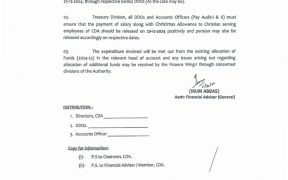 اسلام آباد سی ڈی اے مزدور یونین (سی بی اے) کے ساتھ طے شدہ معاہدے کے تحت سی ڈی اے انتظامیہ نے مسیحی ملازمین کے لیے انکے مذہبی تہوارکرسمس کے موقع پر ادارے میں کام کرنے والے تمام مسیحی ملازمین کے لیے کرسمس الاؤنس کی منظوری دے دی جسکا باقاعدہ نوٹیفیکیشن جاری کردیا گیا ہے۔نوٹیفیکیشن […]