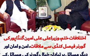 اختلافات ختم، وزیراعلی علی امین گنڈا پور کی گورنر فیصل کنڈی سے ملاقات، صوبے میں امن و امان اور دیگر مسائل پر تبادلہ خیال، گورنر کی صوبائی مسائل کے حل کے لیے وہ وفاق سے رابطہ کرنے کی یقین دہانی