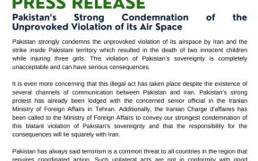 Pakistan strongly condemns the unprovoked violation of its airspace by Iran which resulted in death of two innocent children while injuring three girls. This violation of Pakistan’s sovereignty is completely unacceptable and can have serious consequences. It is even more concerning that this illegal act has taken place despite the existence of several channels […]