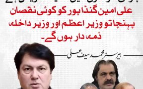 وزیر اعلیٰ کی خیریت سے متعلق پارٹی کارکنوں میں شدید تشویش ہے،علی امین گنڈا پور کو کوئی نقصان پہنچا تو وزیر اعظم اور وزیر داخلہ ذمہ دار ہوں گے۔ بیرسٹر محمد سیف علی