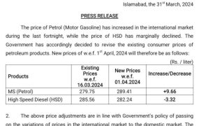 اسلام آباد حکومت نے پیٹرول کی قیمت میں اضافہ کر دیا۔دیگر کی قیمتوں میں کمی زرائع پیٹرول کی قیمت میں 9 روپے 66 پیسے فی لیٹر اضافہ کیا گیا ہے جس کے بعد پٹرول کی نئی قیمت 289 روپے 41 پیسے فی لیٹر مقرر ہوگئی ہے۔ دوسری جانب ڈڈیزل کی قیمت میں 3 روپے 32 […]