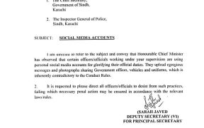 کراچی (اردو ٹائمز) سرکاری دفتر، سرکاری گاڑی، سرکاری وردی کی سوشل میڈیا پر ویڈیوز اور تصاویر بنا کر ذاتی تشہیر کے لئے استعمال کرنے والے سرکاری ملازمین اور آفیسرز کے خلاف وزیر اعلی سندھ کا چیف سیکریٹری اور آئی جی سندھ کو محکمہ جاتی کاروائی کا حکم