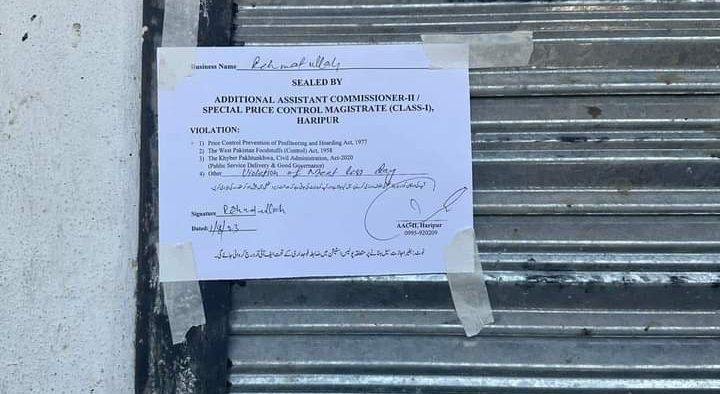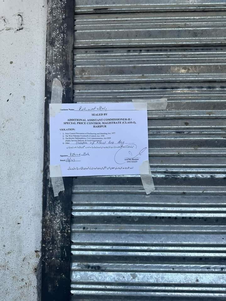 ڈپٹی کمشنر ہریپور کی خصوصی ہدایت پر ایڈیشنل اسسٹنٹ کمشنر(دوئم) ہری پور نے گزشتہ روز افغان معاجرین کیمپ کی چیکنگ کے دوران ناغہ والے دن گوشت فروخت کرنے پہ بھاری جرمانے عائد کئے، ناغہ کے روز گوشت فروخت کرنے پر 2 دوکانوں کو سیل کر دیا گیا، علاقہ مکینوں کا ڈپٹی کمشنر ہری پور کو خراج تحسین،