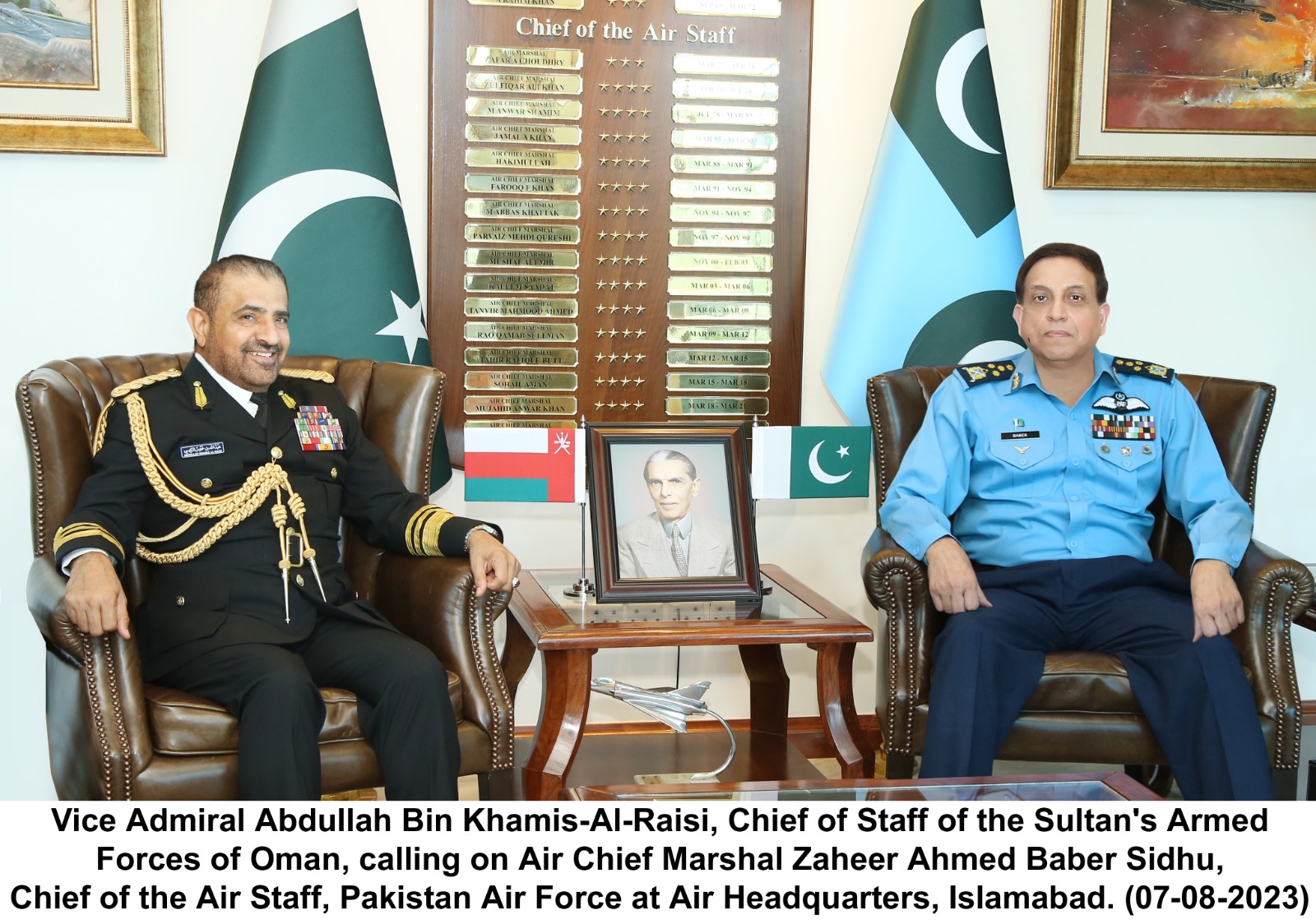 07 August, 2023: Vice Admiral Abdullah Bin Khamis-Al-Raisi, Chief of Staff of the Sultan’s Armed Forces of Oman, called on Air Chief Marshal Zaheer Ahmed Baber Sidhu, Chief of the Air Staff, Pakistan Air Force in his office today. During the meeting, key areas of mutual interest, geo political environment and regional developments were discussed.
