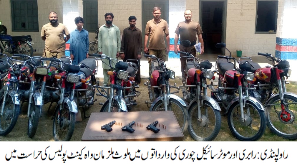 ،رابری اورموٹرسائیکل چوری کی وارداتوں میں ملوث گینگ کا سرغنہ ساتھیوں سمیت گرفتار،چوری شدہ 09موٹرسائیکل اور اسلحہ برآمد۔تفصیلات کے مطابق واہ کینٹ پولیس نے کاروائی کرتے ہوئے رابری اورموٹرسائیکل چوری کی وارداتوں میں ملوث گینگ کے سرغنہ کو ساتھیوں سمیت گرفتارکرلیا، گرفتار ملزمان میں گینگ کا سرغنہ آصف، دانیال اور ابرار شامل ہیں،ملزمان سے چوری شدہ 09موٹرسائیکل اوراسلحہ برآمد ہوا، ایس پی پوٹھوہارمحمد وقاص خان نے واہ کینٹ پولیس کو شاباش دیتے ہوئے کہاکہ شہریوں کی جان ومال کا تحفظ اولین ترجیح ہے،منظم اورمتحرک گینگز کے خلاف کاروائیوں میں مزید تیزی لائی جارہی ہے۔راولپنڈی( )ایس ایچ او تھانہ واہ کینٹ عامر رفیق کی ہمراہ پولیس ٹیم کاروائی،رابری اورموٹرسائیکل چوری کی وارداتوں میں ملوث گینگ کا سرغنہ ساتھیوں سمیت گرفتار،چوری شدہ 09موٹرسائیکل اور اسلحہ برآمد۔تفصیلات کے مطابق واہ کینٹ پولیس نے کاروائی کرتے ہوئے رابری اورموٹرسائیکل چوری کی وارداتوں میں ملوث گینگ کے سرغنہ کو ساتھیوں سمیت گرفتارکرلیا، گرفتار ملزمان میں گینگ کا سرغنہ آصف، دانیال اور ابرار شامل ہیں،ملزمان سے چوری شدہ 09موٹرسائیکل اوراسلحہ برآمد ہوا، ایس پی پوٹھوہارمحمد وقاص خان نے واہ کینٹ پولیس کو شاباش دیتے ہوئے کہاکہ شہریوں کی جان ومال کا تحفظ اولین ترجیح ہے،منظم اورمتحرک گینگز کے خلاف کاروائیوں میں مزید تیزی لائی جارہی ہے۔