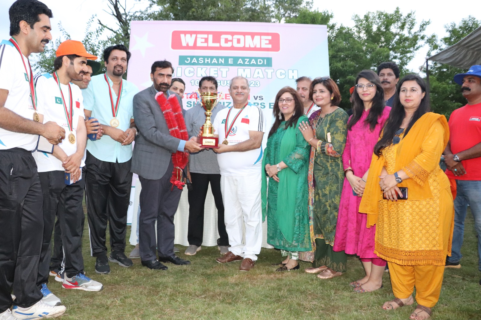 جشن آزادی تقریبات کےسلسلے میں آل پاکستان چائینیز اوورسیز یوتھ فیڈریشن کے زیر انتظام کھیلےجانےوالےجشن آزادی کرکٹ میچ میں سینئرصحافیوں پرمشتمل میڈیا الیون ٹیم نےشوبز الیون کو4 وکٹوں سے ھرا کرکامیابی حاصل کرلی ۔اس شاندار کامیابی پر فاتح ٹیم میڈیا الیون کے کپتان افضل بٹ کوخوبصورت ٹرافی ,میڈیا الیون کے طارق چوہدری ، عابد عباسی ،اصغرعلی مبارک ، زاہد فاروق ملک،عدنان حیدر، شکیل اعوان جب کہ اداکاروں کی جانب سے ذوالقرنین حیدر، کیپٹن آغا شیراز،کلیم خان، شبیر شاہ ،عماد بٹ، سلمان احمد ،بابر عباس، صابر سنی، شیری خان، انجم عباسی ،رمیض، عزیر کلیم ، ذیشان حیدر ، کرم خان ، لیاقت شاہ ، جھلک اور نور کو گولڈ میڈلز سے نوازا گیا۔ میچ کے آفیشل اسکورر ایم رافع شبیر جب کہ ایمپائرز راجہ افتخار اور شبیر احمد تھے .بہترین بالنگ پر شیزاز کو شیلڈ سے نوازا گیا۔میڈیا الوین کے کپتان افضل بٹ کی جانب سے عاصمہ بٹ اورسابق ڈپٹی سپیکر آزاد کشمیر شاہین کوثر ڈار کو بہترین کرکٹ میچ کے انعقاد پر مباک باد پیش کی۔