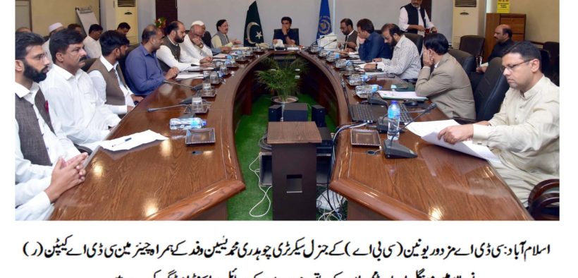 اسلام آباد (اردو ٹائمز) سی ڈی اے مزدور یونین (سی بی اے) کے وفد کی چیئرمین سی ڈی اے او ربورڈ ممبران کے ساتھ مزدوروں کے مسائل پر ایجنڈامیٹنگ کانفرنس ہال چیئرمین آفس سی ڈی اے میں منعقد ہوئی