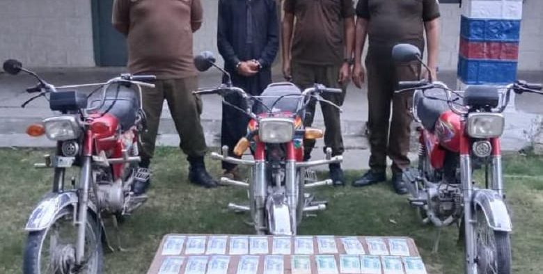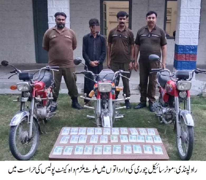 راولپنڈی( )ایس ایچ او واہ کینٹ عامر رفیق کی ہمراہ پولیس ٹیم اہم کاروائی، موٹر سائیکل چوری کی وارداتوں میں ملوث ملزم گرفتار،چوری شدہ 03 موٹر سائیکل اور مسروقہ رقم 25000 روپے برآمد۔تفصیلات کے مطابق واہ کینٹ پولیس نے کاروائی کرتے ہوئے موٹرسائیکل چوری کی وارداتوں میں ملوث ملزم دلاور کو گرفتارکرلیا، ملزم سے چوری شدہ 03موٹرسائیکل اورمسروقہ رقم 25000روپے برآمد ہوئے،ایس پی پوٹھوہار محمد وقاص خان کا کہناتھاکہ شہریوں کی جان ومال کی حفاظت اولین ترجیح ہے،منظم اور متحرک گینگز کے خلاف کاروائیوں میں تیزی لائی جارہی ہے۔