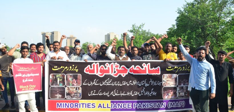 اسلام آباد ( )مینارٹی الائنس پاکستان اسلام آباد کے پریزیڈنٹ آصف جان کی قیادت میں پریس کلب اسلام آباد کے سامنےاحتجاج کیا گیا جس میں جڑانوالہ میں مذہب کی آڑ میں مقدس چرچز , انجیل مقدس اور مسیحوں کے گھرانوں کے جلاؤ گھراؤ اور لوٹ مار کرنے کی شدید الفاظ میں مذمت کرتے ہیں اور حکومت وقت سے پور زور مطالبہ کرتی ہے کہ حالات کو پرامن رکھنے میں اپنا مثبت کردار ادا کرےاور ذمہ داران شر پسند عناصر کے خلاف جنہوں مسجدوں کے لاؤڈ سپیکروں سے انتشار پھیلایا اور قانون کو اپنے ہاتھوں میں لیا سخت قانونی کاروائی عمل میں لائی جائے اور ان کو قرار واقعی سزائیں دی جائیں مینارٹی الائنس پاکستان حکومت سے یہ بھی مطالبہ کرتی ہے کہ تمام چرچز کو فل فور تعمیر کرائے بے گناہ اور غریب مسیحوں کے گھرانوں کا جتنا بھی نقصان ہوا ہے وہ نقصان پورا کیا جاے اور ہائیکورٹ چیف جسٹس کی کی قیادت جوڈیشل انکوائری کمیشن بنایا جائے جب تک ہمارے مطالبات پورے نہیں ہوتے منارٹیز الائنس پاکستان اکمل بھٹی چئیرمین مینارٹیز الائنس پاکستان کی قیادت میں پورے پاکستان میں احتجاج جاری رکھے گی