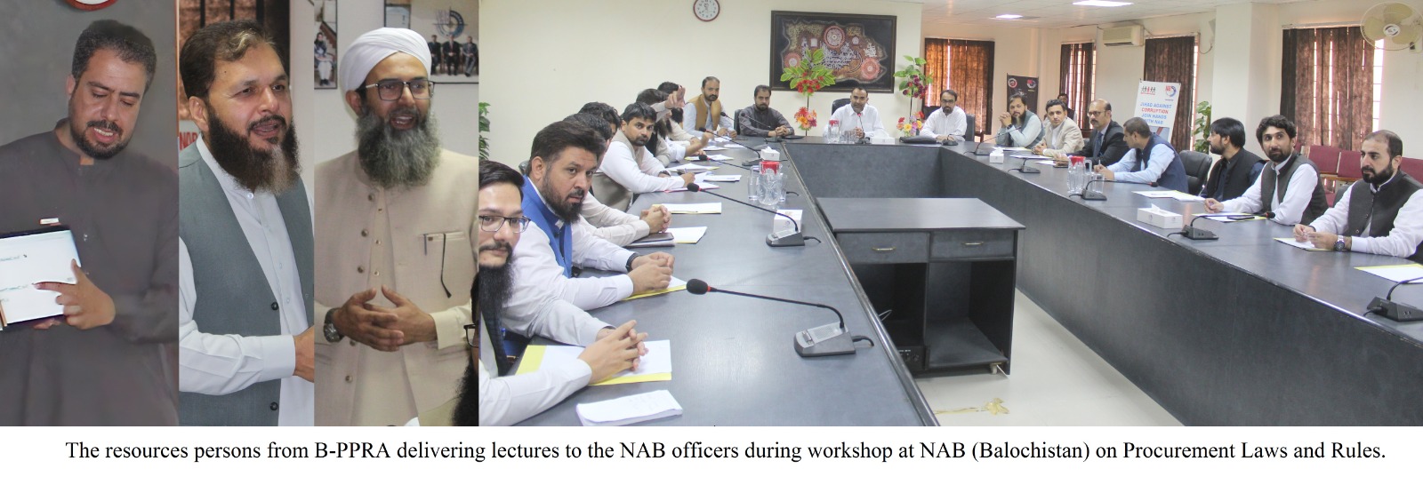 National Accountability Bureau (Baluchistan) in collaboration with Balochistan Public Procurement Regulatory Authority arranged a 2 days workshop for NAB officers at NAB (Balochistan). The purpose of workshop was to create awareness among the NAB officers regarding laws and rules on procurement. Director (CB) B-PPRA Mr. Abdul Hameed Buzdar along with procurement specialists Mr. Mubashir Ali Khan, Mr. Muhammad Laique Tariq and other resource persons delivered their lectures on procurement process.