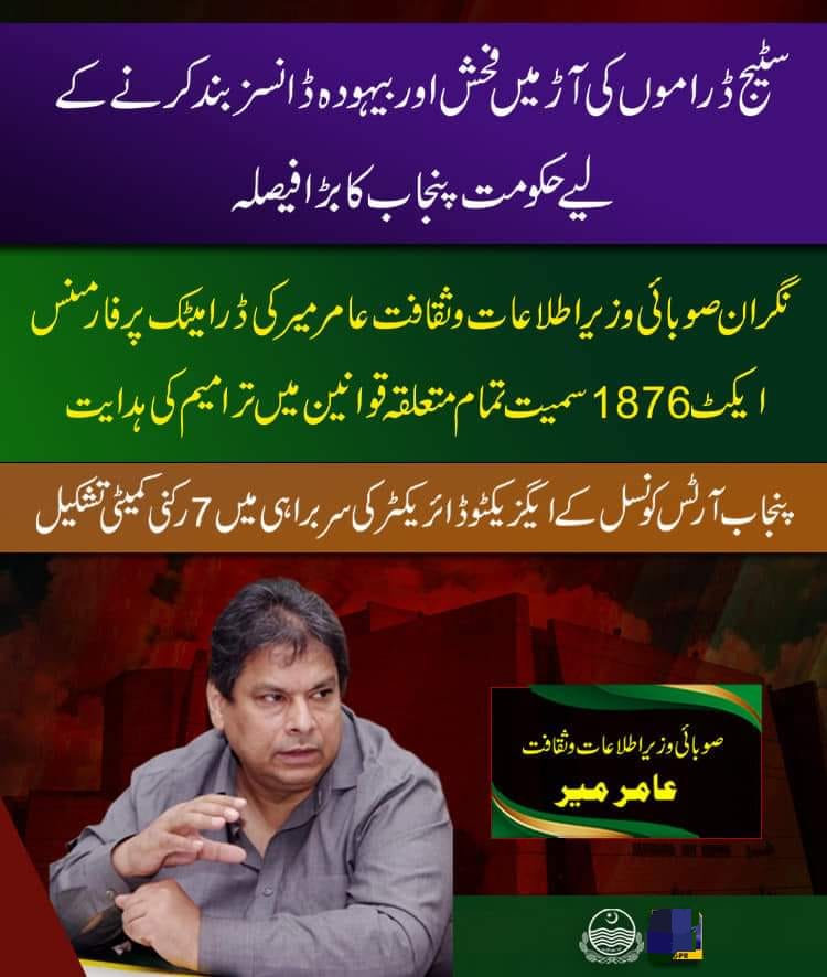 پاکستان تازہ ترین لاہور(اردو ٹائمز)سٹیج ڈراموں کی آڑ میں فحش اور بیہودہ ڈانسز بند کرنے کے لیے حکومت پنجاب کا بڑا فیصلہ admin 2023-08-31 Share لاہور (ملک عمران اعوان) سٹیج ڈراموں کی آڑ میں فحش اور بیہودہ ڈانسز بند کرنے کے لیے حکومت پنجاب کا بڑا فیصلہ #CaretakerGovernment #minister #information #culture #theaters #vulgar #drama #stage #dance #ban #sealed