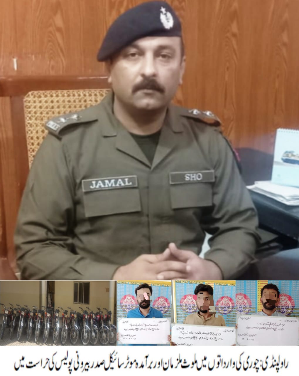 موٹرسائیکل چوری کی وارداتوں میں ملوث 03 ملزمان گرفتار،چوری شدہ13 موٹرسائیکل برآمد۔تفصیلات کے مطابق صدر بیرونی پولیس نے کاروائی کرتے ہوئے موٹر سائیکل چوری کی وارداتوں میں ملوث 03 ملزمان کو گرفتار کر لیا، گرفتار ملزمان میں محسن، وسیم اور سلیم شامل ہیں،ملزمان سے چوری شدہ 13 موٹر سائیکل برآمد کر لیے،ایس پی صدر نے ایس ایچ او صدر بیرونی اور پولیس ٹیم کو شاباش دیتے ہوئے کہا کہ ملزمان کو ٹھوس شواہد کے ساتھ چالان کر کے قرار واقعی سزا دلوائی جائے گی،شہریوں کو انکے اثاثے سے محروم کرنے والے ملزمان قانون کی گرفت سے نہیں بچ سکتے۔