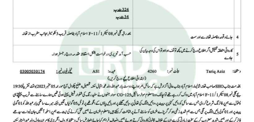 Islamabad(Urdu Times): A case of firing incident has been registered in Sector F-11 of Shalimar Police Station, Islamabad