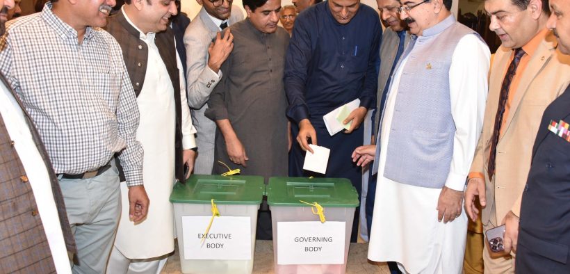 Islamabad: The Chairman Senate, Muhammad Sadiq Sanjrani alongwith the members of the Senate visited the polling area setup at Parliament House to observe the election process being held to elect the office bearers of Parliamentary Reporters Association (PRA).