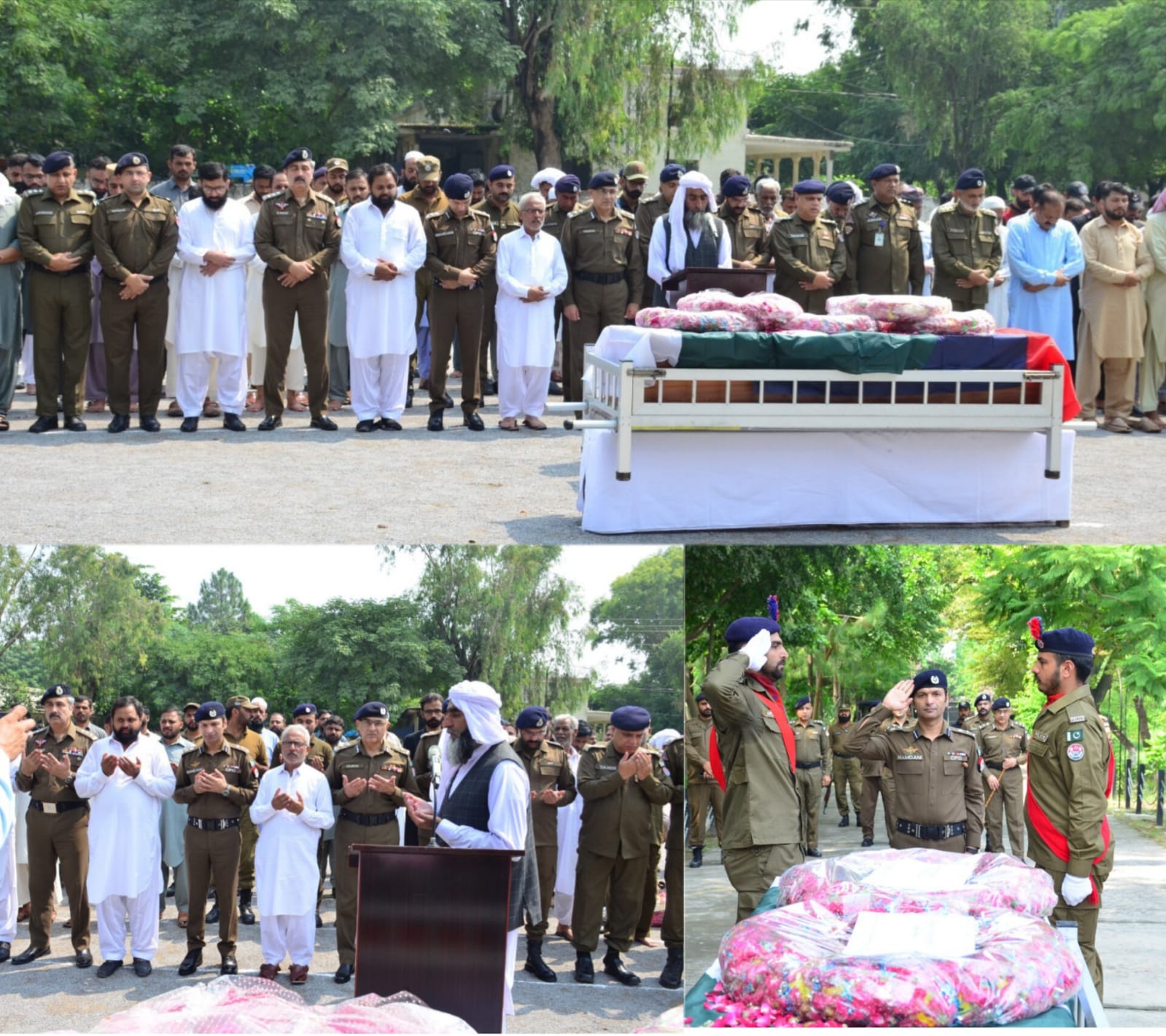 ، آر پی او راولپنڈی سید خرم علی، سی پی او راولپنڈی سید خالدہمدانی، ایس ایس پی آپریشنزفیصل سلیم، سینئر پولیس افسران، شہید کے اہل خانہ اور پولیس افسران کی کثیر تعداد میں شرکت، کانسٹیبل عدیل ظفر گزشتہ رات بحریہ ٹاؤن روات کے علاقہ میں ڈاکؤوں کی فائرنگ سے شہید ہوئے تھے، واقعہ میں کانسٹیبل عاشر اور عادل بھی زخمی ہوئے جن کا علاج معالجہ جاری ہے، فائرنگ کے تبادلے میں تین ڈاکو بھی ہلاک ہوئے، شہید کانسٹیبل عدیل ظفر نے سوگواران میں والد، والدہ، بیوہ اور دو بیٹوں کو چھوڑا ہے، آر پی اوسید خرم علی نے کہاکہ شہید کانسٹیبل عدیل ظفر نے بہادری اور شجاعت کی عظیم داستان رقم کی، شہداء پولیس محکمہ کا اثاثہ اور فخر ہیں، شہید کے اہل خانہ ہماری فیملی کی طرح ہیں ان کی ویلفیئر کا ہمیشہ خیال رکھا جائے گا، سی پی اوسید خالدہمدانی کا کہناتھاکہ شہید کانسٹیبل عدیل ظفر نے خطرناک ڈاکؤوں سے لڑتے ہوئے اپنی جان قربان کی، راولپنڈی پولیس کے 116 افسران فرض کی راہ میں اپنی جانوں کا عظیم نذرانہ پیش کر چکے ہیں، واقعہ میں زخمی کانسٹیبل عاشر اور عادل ہمارے غازی ہیں، دکھ کی اس گھڑی میں شہید کے اہل خانہ کے ساتھ کھڑے ہیں، شہداء اور غازیوں نے شہریوں کے جان و مال کی حفاظت کے دوران فرض کی راہ میں لازوال قربانیاں دی ہیں۔