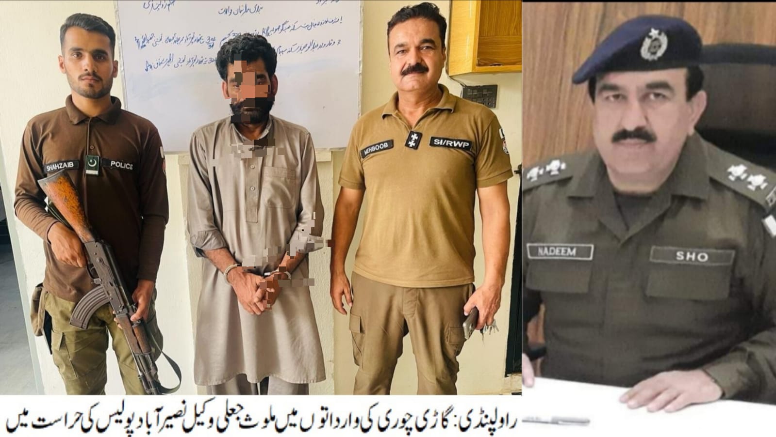 گاڑی چوری کی وارداتوں میں ملوث جعلی وکیل گرفتار، لاکھوں روپے مالیت کی 02 چوری شدہ گاڑیاں برآمد،ملزم شفیق نے جعلی کارڈ تیار کررکھا تھا اوراپنے آپ کو وکیل ظاہر کرتا تھا۔تفصیلات کے مطابق نصیرآباد پولیس نے کاروائی کرتے ہوئے گاڑی چوری کی وارداتوں میں ملوث جعلی وکیل شفیق کو گرفتارکرلیا، ملزم سے لاکھوں روپے مالیت کی 02 چوری شدہ گاڑیاں برآمدہوئیں،ملزم قبل ازیں گاڑی چوری کے متعدد مقدمات میں ریکارڈ یافتہ ہے،ملزم شفیق نے جعلی کارڈ تیار کررکھا تھا اوراپنے آپ کو وکیل ظاہر کرتا تھا،ایس پی پوٹھوہار محمد وقاص خان کا کہناتھاکہ گرفتار ملزم کو ٹھوس شواہد کے ساتھ چالان عدالت کرکے قرارواقعی سزا دلوائی جائیگی،شہریوں کی جان ومال پر حملہ کرنے والے ملزمان قانون کی گرفت سے نہیں بچ سکتے،دھوکہ دہی سے شہریوں کا استحصال کرنے والوں کے خلاف کاروائیاں جاری رہیں گی۔