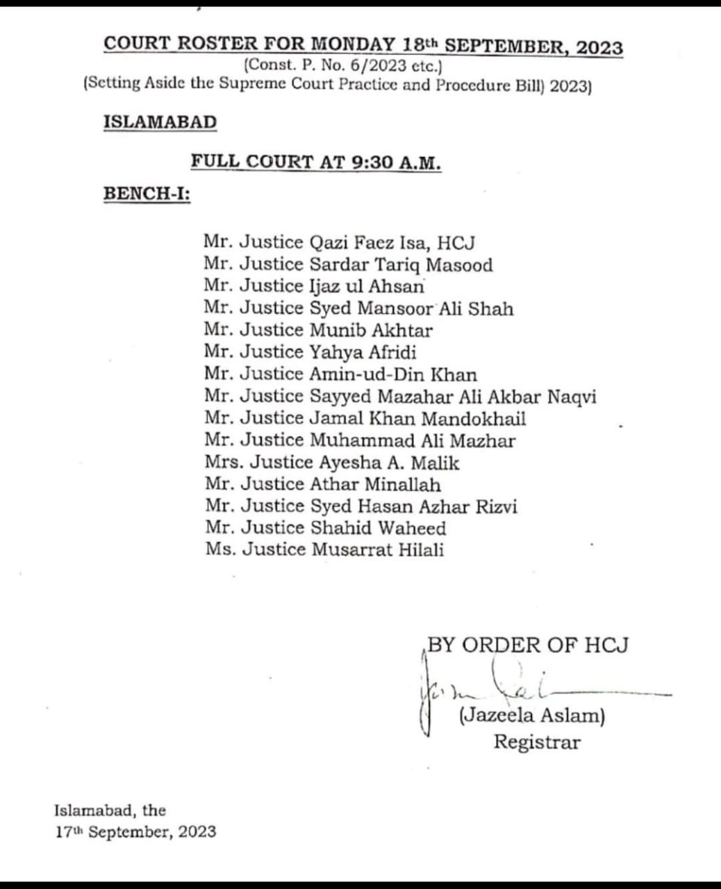 پاکستان تازہ ترین اسلام آباد(اردو ٹائمز)سپریم کورٹ میں نئی تعینات ہونے والی رجسٹرار جزیلہ اسلم نے کل فل کورٹ سماعت کا روسٹر جاری کردیا admin 2023-09-17 Share سپریم کورٹ میں نئی تعینات ہونے والی رجسٹرار جزیلہ اسلم نے کل فل کورٹ سماعت کا روسٹر جاری کردیا 15 ججز پر مشتمل فل کورٹ کل سپریم کورٹ پریکٹس اینڈ پروسیجر ایکٹ کے خلاف درخواستوں پر سماعت کرے گی سپریم کورٹ میں دو ججز کی تعیناتی ابھی ہونی ہیں