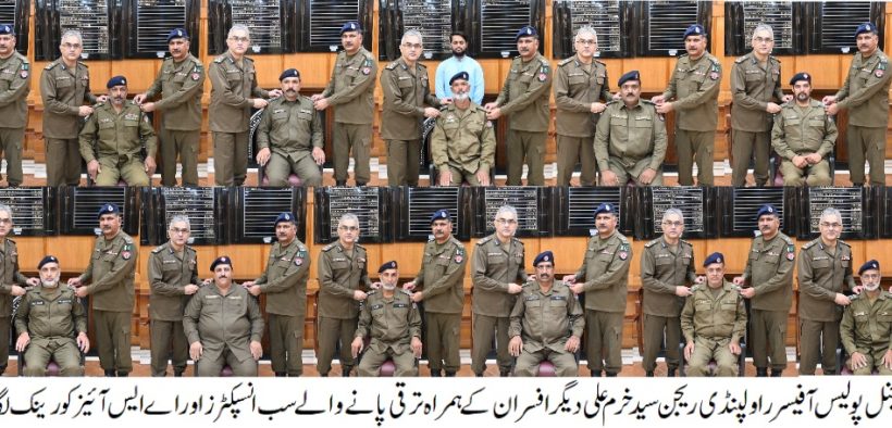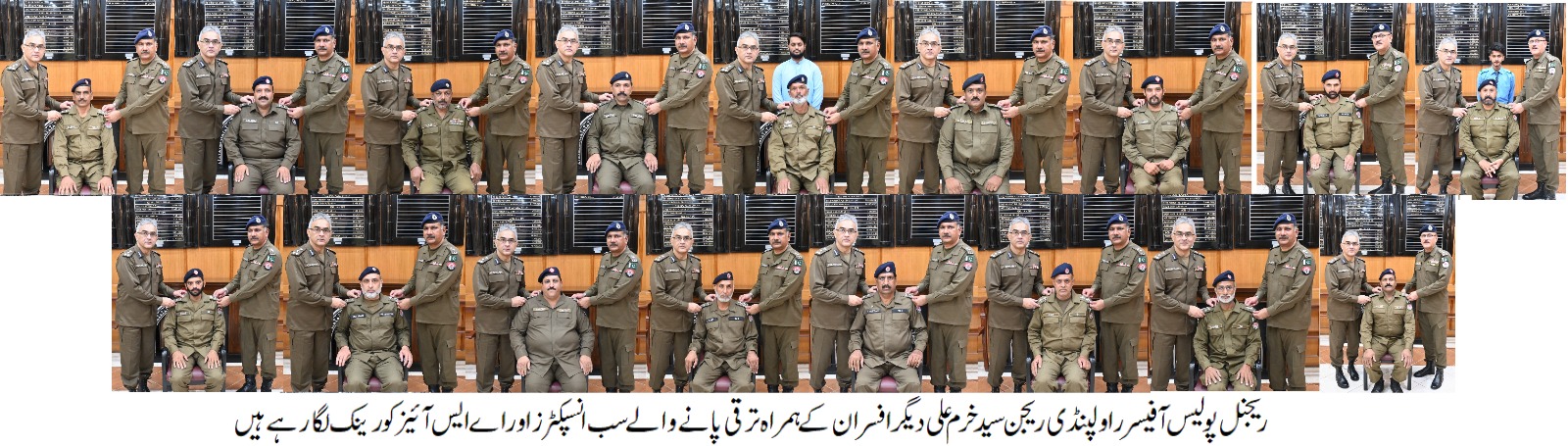 ریجنل پولیس آفیسر راولپنڈی ریجن سید خرم علی نے محکمانہ پروموشن بورڈ کی منظوری پر36 اے ایس آئی سے سب انسپکٹر جبکہ 98 ہیڈ کانسٹیبلان کو اے ایس آئی کے عہدہ پر ترقیابی کے احکامات جاری کر دئیے، ترقی پانے والے افسران کے اعزاز میں رینک لگانے کے لیے ریجنل دفتر میں تقریب کا انعقاد، آ ر پی او راولپنڈی ریجن سید خرم علی، ایس ایس پی آرآئی بی عارف شہباز، ایس ایس پی لیگل عبدالفاروق اور اے ڈی آئی جی نعیم اختر نے راولپنڈی ریجن کے ترقی پانے والے افسران کواے ایس آئی اور سب انسپکٹر عہدہ کے رینک لگائے۔محنت اور لگن سے کام کرنے والے اورمحکمہ کی مثبت شناخت قائم کرنے والے افسران ہی محکمہ کا اصل سرمایہ ہیں، آپ کی محکمانہ ترقی نہ صرف آپکے لیے خوشی کا باعث ہے بلکہ پورے خاندان کے لیے باعث فخر ہے،آپ اس معیار میں مزید اضافہ کرتے ہوئے میرٹ اور انصاف کی فراہمی کو یقینی بنائیں،آر پی او سید خرم علی