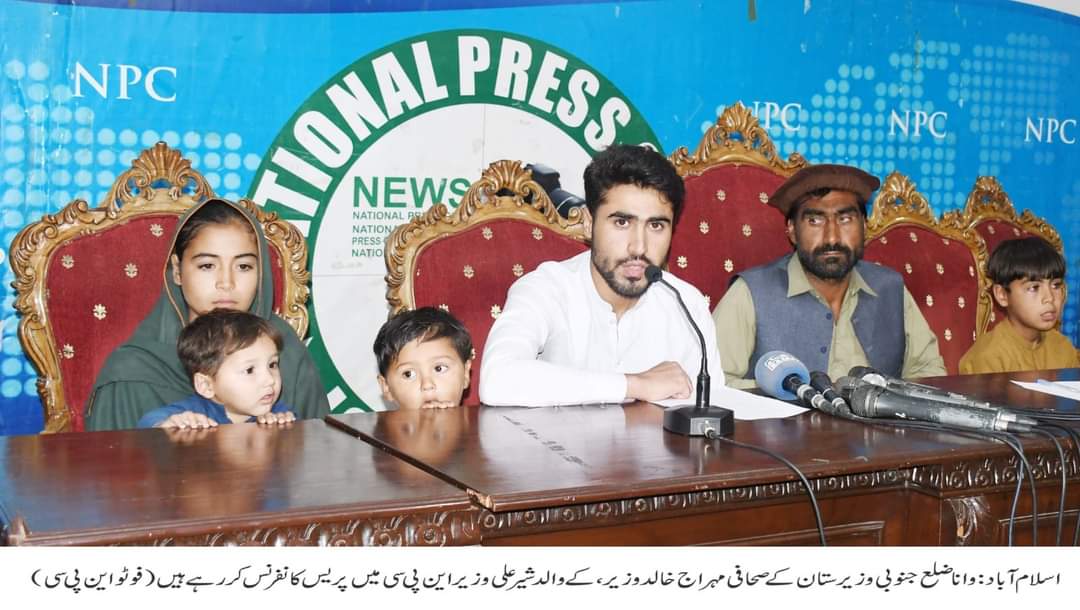 جنوبی وزیرستان کی تحصیل وانا کے نوجوان صحافی معراج خالد وزیر کے بھائی سراج خالد وزیر نے کہا ہے کہ انکے بھائی کو سوشل میڈیا پر ایک پوسٹ کرنے کی پاداش میں قبائلی جرگے کی طرف سے پانچ لاکھ جرمانہ کیا گیا جس کی عدم ادائیگی پر انکے مکان کو مسمار کرنے کی کوشش کی گئی تاہم کچھ اہم لوگوں کے بروقت اقدامات کے باعث انکے مکان کو مسمار نہیں کیا جا سکا جس پر جرگے نے انکے خاندان کو علاقہ بدر کرنے اور انہیں کھانا یا رہائش دینے والوں پر بھی دس لاکھ جرمانے کا اعلان کیا ہے جس کے باعث وہ اپنا علاقہ چھوڑ کر اسلام آباد میں رہائش اختیار کرنے پر مجبور ہیںلہذاٰ انکے خاندان کو تحفظ فراہم کیا جائے، نیشنل پریس کلب اسلام آباد میں اپنے والد شیر علی وزیر اور بچوں کے ہمراہ پریس کانفرنس کرتے ہوئےمعراج خالد وزیر کے بھائی سراج خالد وزیر کا مزید کہنا تھا کہ انکا تعلق جنوبی وزیر ستان کے علاقے وانا سے ہے، چند دن پہلےانکے بھائی معراج خالد وزیر نے سوشل میڈیا پر ایک پوسٹ شیئرکی تھی جس میں جرگے کے فیصلوں کو انسانی ہمدردی کے تحت نرمی کرنے کا مشورہ دیا تھا اور کہا تھا کہ کی کا گھر مسمار کرنے سے گریز کیا جائے کیونکہ اس سے بچے اور فیملیز سب سے زیادہ متاثر ہوتے ہیں جس پر قبائلی جرگہ کی نو رکنی کمیٹی نے اس پوسٹ کے بدلے معراج خالد وزیر کے والد شیر علی خان پر پانچ لاکھ جرمانہ عائد کیا، لیکن شیر علی خان جرمانہ ادا نہیں کر سکے جس پرنوکنی کمیٹی نے شیر علی خان کو گھر خالی کرنے کا کہا ،شیر علی وزیر نے دوسرے گھر پناہ لے لی اورشیر علی کے گھر کو پولیس نے تحفظ میں لے لیااس کے بعد نور کنی کمیٹی نے فیصلہ کیا کہ جو بھی شیر علی خان کو رہائش یا کھانا دے اسکو دس لاکھ جرمانہ کیا جائے گا، ان حالات سے مجبور ہو کر شیر علی خان نے اپنے خاندان سمیت علاقہ چھوڑنے پر مجبور ہوئے ہیں، حکومت وقت سے درخواست ہے کہ قبائلی علاقہ 2018 ء میں صوبے کے کپ میںضم ہو چکا ہےلہذاٰیہانں پر فیصلے قبائلی جرگے کے بجائے عدالتوں میں ہونے چاہیں کیو نکہ قبائلی اضلاع میں پولیس اور عدلیہ موجود ہےجسے فعال کرنے کی ضرورت ہےان کا مزید کہنا تھا کہ واقعہ کے بعد نگران وزیر علیٰ خیبر پختو نخو ا اعظم خان نے واقعہ کا نوٹس لیا اور متاثرہ خاندن کو تحفظ فراہم کرنے کا اعادہ کیا اور کہا کہ کسی بھی شخص یا گروہ کو یہ اجازت نہیں کہ کسی کا گھر مسمار کرے لہذا ہمیں تحفظ فراہم کیا جائے۔