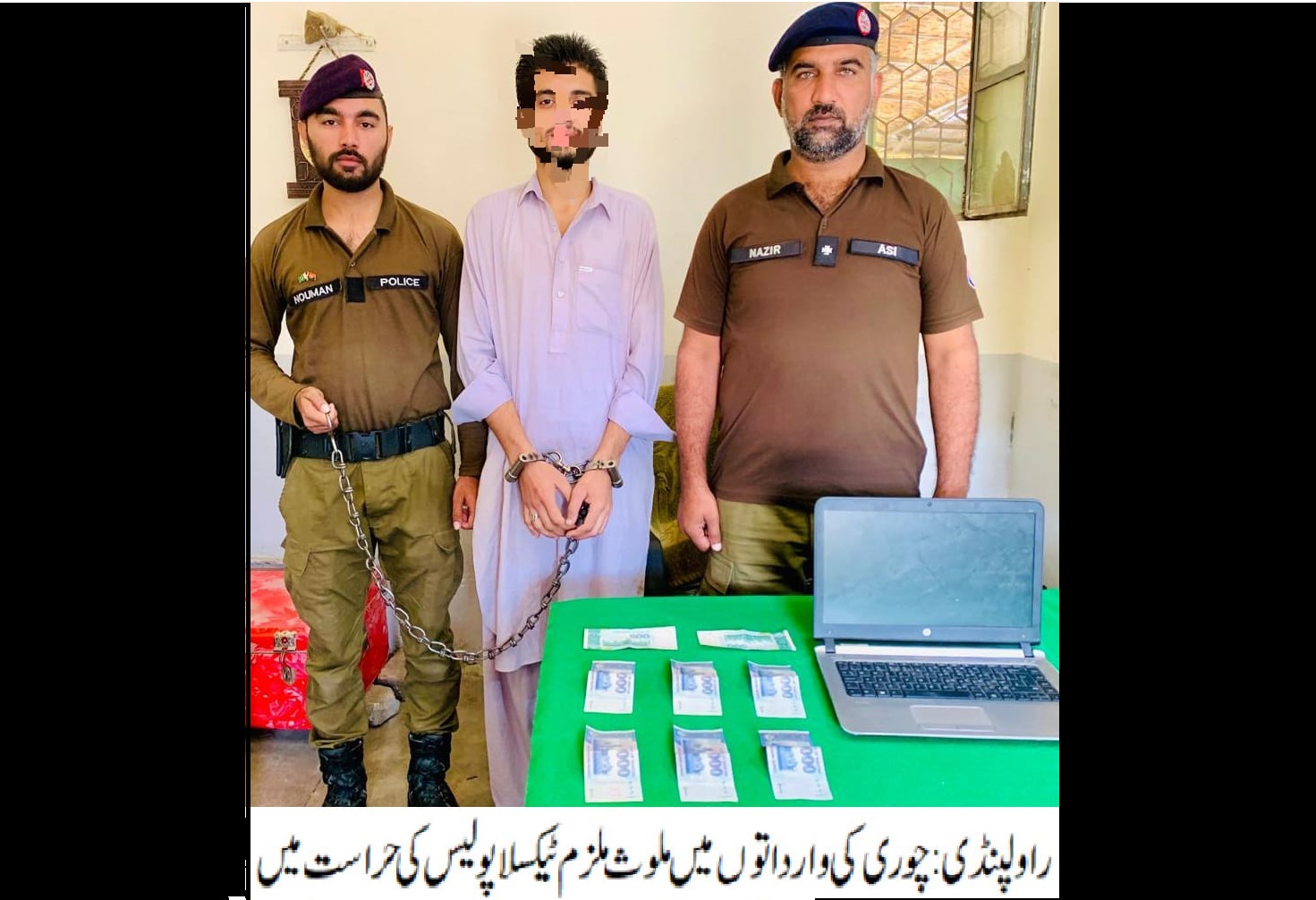 ایس ایچ او ٹیکسلا رفیق خان کی زیرنگرانی پولیس ٹیم کی کاروائی، چوری کی وارداتوں میں ملوث ملزم گرفتار،چوری شدہ لیپ ٹاپ اور 07 ہزار روپے برآمد۔تفصیلات کے مطابق ٹیکسلا پولیس نے کاروائی کرتے ہوئے چوری کی وارداتوں میں ملوث ملزم کو گرفتار کر لیا،ملزم کی شناخت سیف اللہ خان کے نام سے ہوئی،ملزم سے چوری شدہ لیپ ٹاپ اور 07ہزار روپے برآمد کر لیے،ایس پی پوٹھوہار محمد وقاص خان کاکہنا تھا کہ گرفتار ملزم کو ٹھوس شواہد کے ساتھ چالان کرکے قرار واقعی سزا دلوائی جائے گی،شہریوں کی جان ومال کی حفاظت اولین ترجیح ہے۔