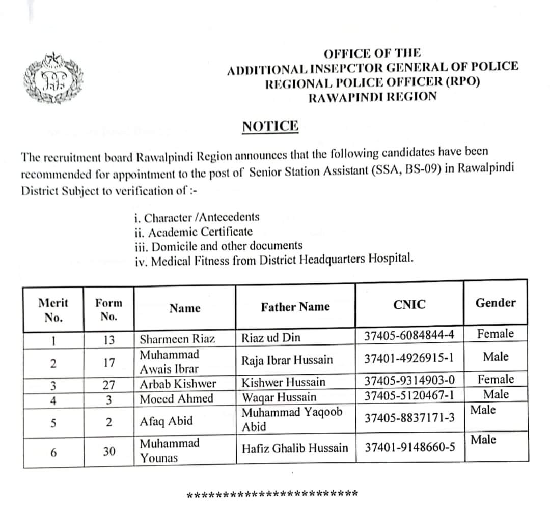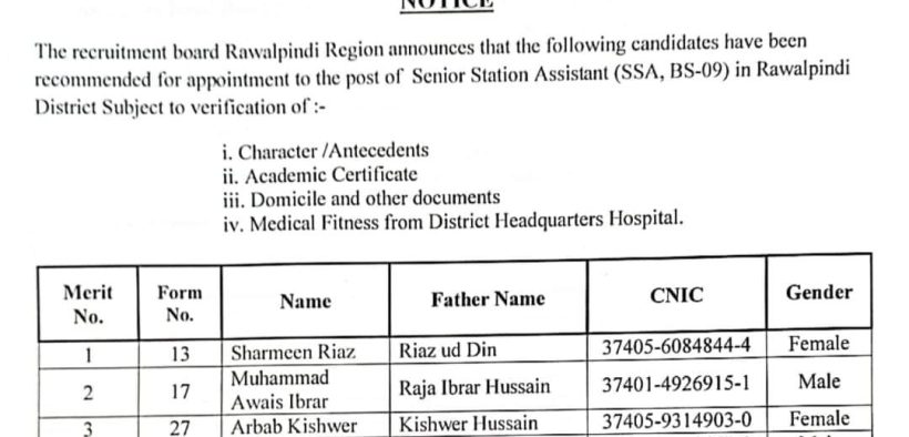 پاکستان تازہ ترین راولپنڈی(اردو ٹائمز) ریجن میں پی ایس اے اور ایس ایس اے کی بھرتی کے لیے کامیاب امیدواران کی حتمی فہرست جاری کردی گئی admin 2023-10-02 Share راولپنڈی ریجن میں پی ایس اے اور ایس ایس اے کی بھرتی کے لیے کامیاب امیدواران کی حتمی فہرست جاری کردی گئی. راولپنڈی ضلع کے کامیاب ہونے والے امیدواران مزید مراحل(میڈیکل فٹنس ٹیسٹ و دستاویزات ویریفیکیشن وغیرہ) کے لیے رابطہ کریں۔