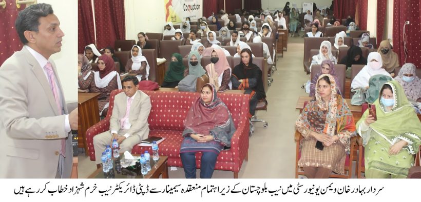 قومی احتساب بیورو( بلوچستان ) کی جانب سے سردار بہادر خان ویمن یونیورسٹی کوئٹہ میں بدعنوانی کے خلاف آگاہی مہم کے حوالے سے سیمینار کا انعقاد کیا گیا۔ سیمینار کا بنیادی مقصد طلبا و طالبات میں بدعنوانی کے خلاف آگاہی و نفرت کو اجاگر کرنا تھا۔سیمینار میں ڈپٹی ڈائریکٹرنیب خرم شہزاد اور ڈاکٹر گل بوٹی ڈین اف مینیجمنٹ سائنسز نے اپنے خیالات کا اظہار کرتے ہوئے طالبات کو کرپشن کے خاتمے میں اپنا کردار ادا کرنے پر زور دیا۔ بدعنوانی کو فعال طور پر مسترد کر کے اپنے موجودہ ماحول اور اس سے آگے کی تشکیل میں اہم کردار ادا کرنے کی تاکید کی گئی ۔ اخلاقی اقدار کو فروغ دے کر، نوجوان افراد ایک مضبوط اخلاقی اقدار پیدا کر سکتے ہیں جو اسلامی تعلیمات سے ہم آہنگ ہو۔ مقررین نے عصری معاشرے کے ہر پہلو میں ایمانداری، دیانتداری اور خود احتسابی کی ضرورت پر زور دیا۔ دیانتداری اور اسلامی اصولوں کی پاسداری کے ذریعے طلباء اپنے اردگرد کی دنیا پر مثبت اثر ڈالنے کی طاقت رکھتے ہیں۔ کمیونٹی پر مبنی سرگرمیوں میں فعال طور پر شفافیت کو فروغ دے کر طلباء ایک منصفانہ معاشرے کی تعمیر میں اپنا حصہ ڈال سکتے ہیں۔ سیمینار میں محترمہ فرحت صفدر صاحبہ رجسٹرار یونیورسٹی ، فیکلٹی ممبرز اور مس صالحہ زمان ڈپٹی ڈائریکٹر نیب اور طلباء نے شرکت کی۔ سیمینار کے اختتام پر ایک علامتی واک کا بھی انعقاد کیا گیا۔ جس میں حاضرین نے بڑھ چڑھ کر حصہ لیا۔