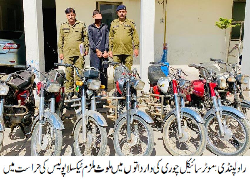 چوری شدہ 07موٹرسائیکل برآمد۔تفصیلات کے مطابق ٹیکسلا پولیس نے کاروائی کرتے ہوئے موٹرسائیکل چوری کی وارداتوں میں ملوث ملزم عبداللہ کو گرفتارکرلیا، ملزم سے چوری شدہ 07موٹرسائیکل برآمدہوئے، ایس پی پوٹھوہار محمد وقاص خان نے ٹیکسلا پولیس کو شاباش دیتے ہوئے کہاکہ شہریوں کی جان ومال کی حفاظت اولین ترجیح ہے، منظم اورمتحرک گینگز کے خلاف کاروائیوں میں تیزی لائی جارہی ہے۔