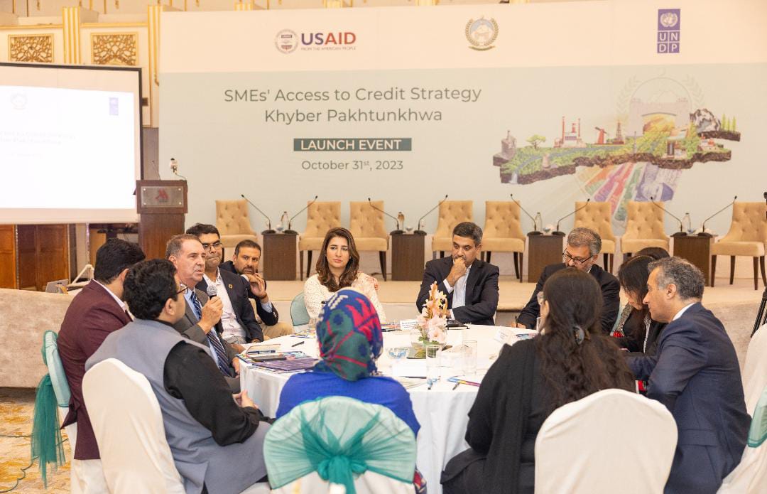Islamabad, October 31, 2023 – The United States Government, through the U.S. Agency for International Development (USAID), the United Nations Development Programme, and the Government of Khyber Pakhtunkhwa jointly launched a strategy on improving access to finance for Small and Medium Enterprises (SMEs) in Khyber Pakhtunkhwa’s merged areas. Stakeholders from the banking sector, Small and Medium Enterprises Development Authority (SMEDA) and the KP Chambers of Commerce also participated and exchanged ideas.