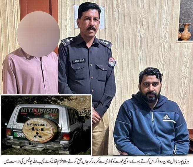 تھانہ کوٹ نجیب اللہ کی حدود حطار روڈ نزد ماڈل ٹاون میں مورخہ 28.10.2023 کو ہری پور کی جانب سے پراڈو نمبری 3014نہایت تیز رفتاری سے آئی جس نے راہ گیر عورت کو ٹکر مار دی ۔ جو کہ عورت موقع پر ہی جاں بحق ہو گئیں۔ گاڑی ڈرائیور موقع سے فرار ہو گیا تھا۔ ایکسیڈنٹ کی ویڈیو سوشل میڈیا پر وائرل ہونے پر ڈی پی او ہری پور نے نوٹس لیتے ہوئے گاڑی سمیت ڈرائیور کو گرفتار کرنے کے ڈی ایس پی سرکل خانپور محمد عزیر اور ایس ایچ او تھانہ کوٹ نجیب اللہ محمد ارشد خان کو ویڈیو میں نظر آنے والی گاڑی کو ٹریس کرکے ملزم کو گرفتار کرنے کے احکامات جاری کیے۔ ایس ایچ او تھانہ کوٹ نجیب اللہ نے ہمراہ نفری پولیس کے ڈی ایس پی سرکل خانپور کی زیرنگرانی مقدمہ میں تفتیش کا آغاز کرتے ہوئے ویڈیو میں نظر آنے والی گاڑی ڈرائیور فیاض خان ولد محمد شیراز سکنہ محلہ امین آباد کو گرفتار کرکے گاڑی نمبری 3014 قبضہ پولیس میں کرلی ۔مقدمہ میں مذید تفتیش جاری ہے،