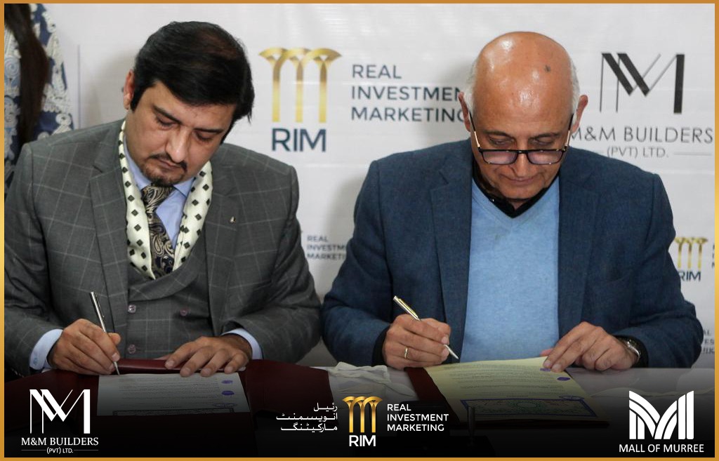 اسلام آباد ۔ریئل انویسٹمنٹ مارکیٹنگ کے سی ای او آصف ملک اور ایم اینڈ ایم بلڈر پرائیویٹ لمیٹڈ کے سی ای او راجہ مہتاب خان نے مین مال روڈ مری پر تعمیر ہونے والے پہلے اور سب سے بڑے انڈور مال 80 فیصد مکمل این او سی منظور شدہ کمرشل پروجیکٹ مال آف مری کے لیے خصوصی فروخت اور مارکیٹنگ کے ایم او یو پر دستخط کیے۔