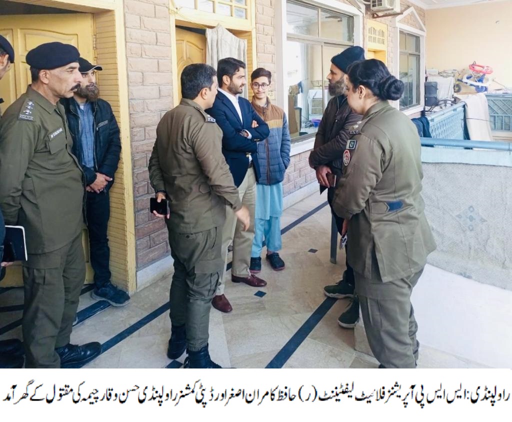 ۔راولپنڈی( )تھانہ ریس کورس کے علاقہ میں رابری کے دوران شہری کے قتل کا واقعہ،ایس ایس پی آپریشنز فلائیٹ لیفٹیننٹ(ر) حافظ کامران اصغر اور ڈپٹی کمشنر راولپنڈی حسن وقار چیمہ کی مقتول کے گھر آمدتفصیلات کے مطابق تھانہ ریس کورس کے علاقہ میں رابری کے دوران شہری کے قتل کے واقعہ پرایس ایس پی آپریشنزفلائیٹ لیفٹیننٹ(ر) حافظ کامران اصغر اور ڈپٹی کمشنر راولپنڈی حسن وقار چیمہ کی مقتول تصرف کے گھر آمد،اے ایس پی کینٹ نے اب تک کی کارروائی کے حوالے سے بریفنگ دی، افسران مقتول کے اہل خانہ سے ملے افسوسناک واقعہ پر اظہار تعزیت اور ملزمان کی جلد گرفتاری کی یقین دہانی کروائی، ملزمان کو جلد از جلد گرفتار کر کے قرار واقعی سزا دلوائی جائے گی۔