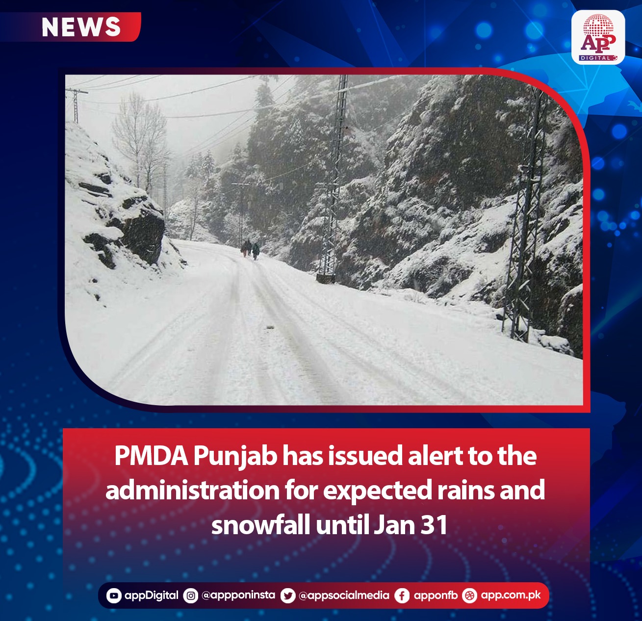 The Provincial Disaster Management Authority (PDMA) Punjab has issued alert to the administration for expected rains and snowfall until Jan 31. A spokesperson for the PDMA told the media on Saturday that there was a possibility of snowfall with light and heavy rain in Murree, Galliat areas from January 27 to 31. Rain is expected at Rawalpindi, Gujranwala, Lahore, Narowal, Mandi Bahauddin, Mianwali, and Sargodha on Jan 30 and 31.