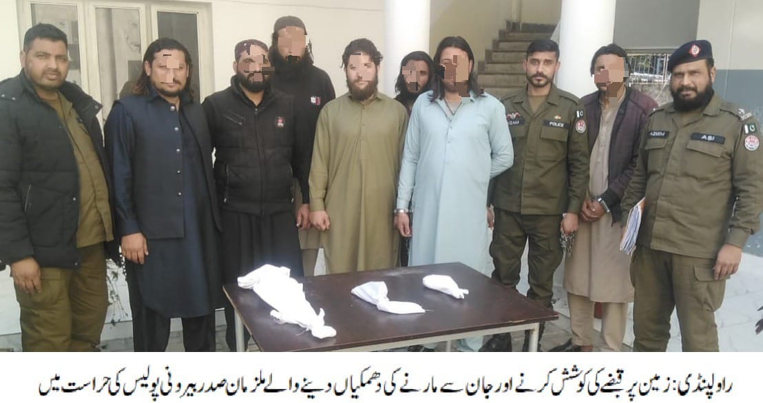 راولپنڈی( )ایس ایچ او تھانہ صدر بیرونی ندیم ظفر کی زیرنگرانی پولیس ٹیم کی کاروائی، زمین پر قبضے کی کوشش کرنے اور جان سے مارنے کی دھمکیاں دینے والے 07 ملزمان گرفتار،کلاشنکوف اور 02 پسٹل برآمد۔تفصیلات کے مطابق صدر بیرونی پولیس نے کاروائی کرتے ہوئے زمین پر قبضے کی کوشش کرنے اور جان سے مارنے کی دھمکیاں دینے والے 07ملزمان کوگرفتار کر لیا،گرفتار ملزمان کی شناخت سمیع اللہ، لال بادشاہ، امیر اللہ، مجیب اللہ، عبدالحمید، عدنان اور خالد کے ناموں سے ہوئی،ملزمان سے کلاشنکوف اور 02پسٹل برآمد ہوئے،ملزمان نے 03 ہفتے قبل زمین پر قبضے کی کوشش کی اور ہوائی فائرنگ کر کے جان سے مارنے کی دھمکیاں دی،ایس پی صدر محمد نبیل کھوکھر نے صدر بیرونی پولیس کو شاباش دیتے ہوئے کہا کہ ملزمان کو چالان عدالت کر کے قرار واقعی سزا دلوائی جائے گی،شہریوں کے جان و مال کی حفاظت پولیس کی اولین ترجیح ہے۔