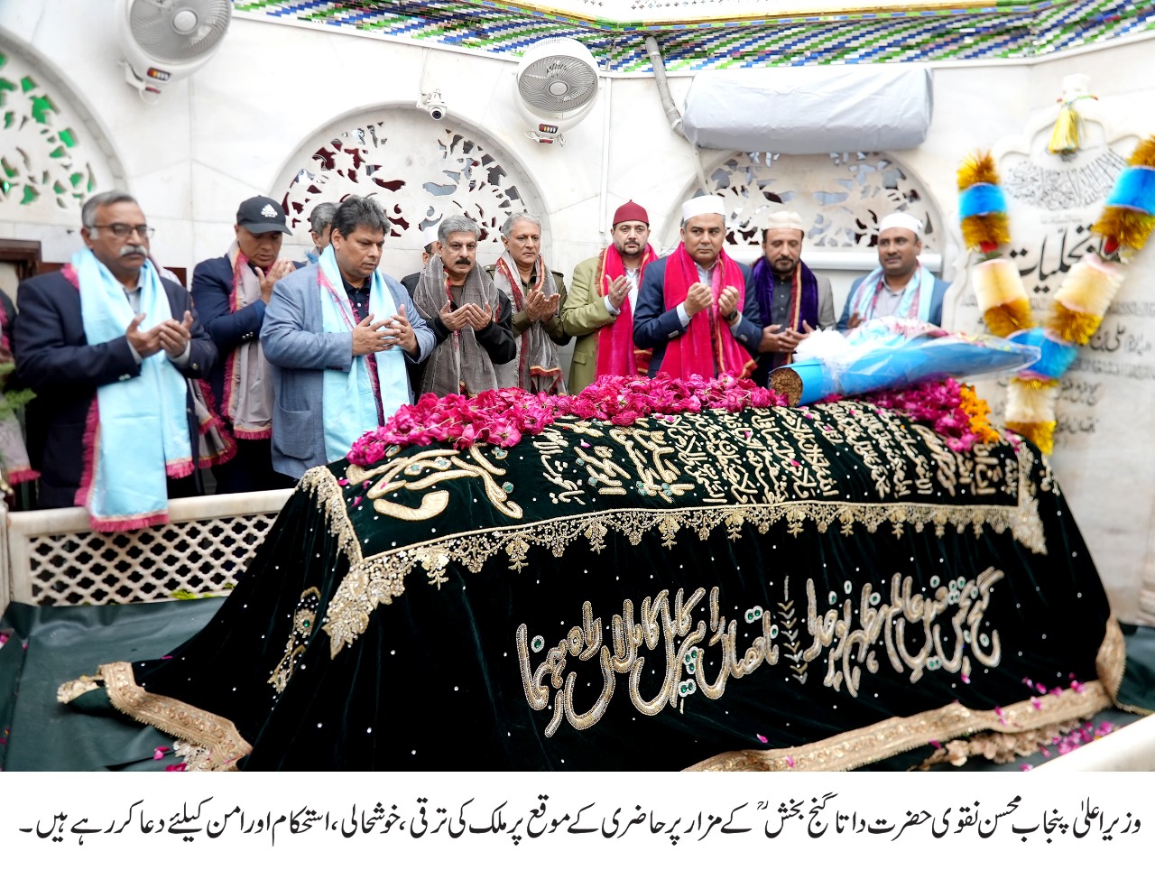 Chief Minister Punjab Mohsin Naqvi visited the Shrine of Hazrat Data Ganj Bakhsh (RA). CM paid tributes to the exemplary religious services rendered by Hazrat Data Ganj Bakhsh (RA) for the promotion of Islam. Mohsin Naqvi prayed for the progress, prosperity, stability and peace of the country. CM especially prayed for the liberation of the oppressed Palestinian and Kashmiri Muslims. Mohsin Naqvi also prayed for the martyrs who laid down their precious lives for the dear homeland. Khateeb Data Darbar Mufti Ramzan Sialvi held a special prayer. Provincial Ministers Azfar Ali Nasir, Amir Mir, Chairman P&D Board, SMBR, IG Police, Commissioner Lahore. CCPO, Secretary Auqaf, Aslam Tareen of Madina Foundation and concerned officials were also present on the occasion.