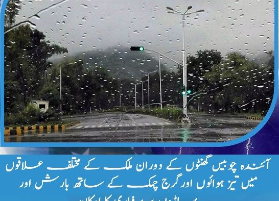 اسلام آباد(اردو ٹائمز) آئندہ چوبیس گھنٹوں کے دوران ملک کے مختلف علاقوں میں تیز ہوائوں اورگرج چمک کے ساتھ بارش اور پہاڑوں پر برفباری کا امکان