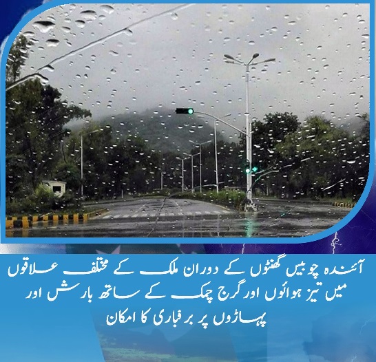 آئندہ چوبیس گھنٹوں کے دوران ملک کے مختلف علاقوں میں تیز ہوائوں اورگرج چمک کے ساتھ بارش اور پہاڑوں پر برفباری کا امکان ہے۔ شمالی بلوچستان میں برفباری سے سڑکیں بند اور گاڑیوں کی آمد ورفت میں خلل جبکہ گوادر، کیچ، پنجگور اور آواران میں موسلادھار بارش کے باعث مقامی ندی نالوں میں طغیانی کا بھی خدشہ ہے۔ مری، گلیات، ناران، کاغان، دیر، سوات، کوہستان، مانسہرہ، ایبٹ آباد، شانگلہ، استور، ہنزہ، سکردو، وادی نیلم، باغ، پونچھ اور حویلی میں برفباری سے گاڑیوں کی آمد ورفت میں خلل کا امکان ہے۔