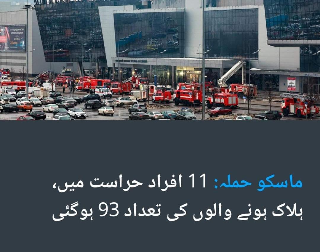 دارالحکومت ماسکو کے ایک کنسرٹ ہال پر فائرنگ کے واقعے میں ہلاک ہونے والوں کی تعداد 93 ہوگئی ہے اور سو سے زائد افراد کے زخمی ہونے کی اطلاع ہے۔ اس واقعے کی ذمہ داری دہشت گرد گروپ اسلامک اسٹیٹ نے قبول کی ہے۔