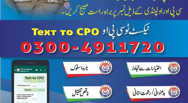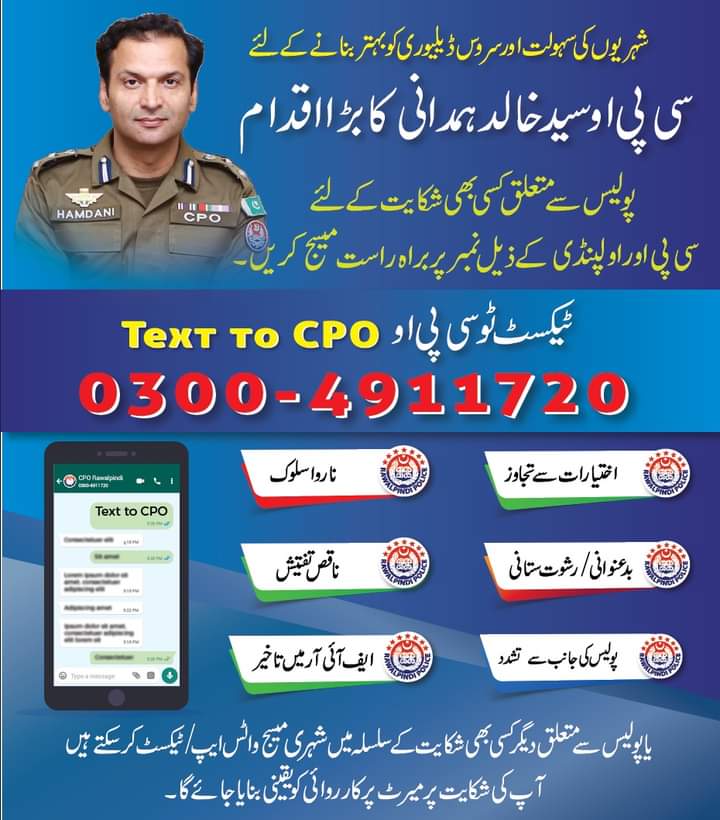شہریوں کی سہولت اور سروس ڈیلیوری کو بہتر بنانے کے لئے سی پی او سید خالد ہمدانی کا اپنی نوعیت کا پہلا اقدام،ٹیکسٹ ٹو سی پی او،شہری پولیس سے متعلق کسی بھی شکایت کے لئے سی پی او راولپنڈی کے ذیل نمبر 03004911720 پر براہ راست میسج کریں،گزشتہ چھ ماہ کے دوران شہریوں کی جانب سے کل 1560 شکایات موصول ہوئیں، شہریوں کی99%سے زائد شکایات کا بروقت ازالہ یقینی بنایاگیا،اس حوالے سے 103 مقدمات درج ہوئے جبکہ 14شکایات پر کاروائی عمل میں لائی جارہی ہے،شہری اختیارات سے تجاوز،بدعنوانی/رشوت ستانی،پولیس کی جانب سے تشدد،ناروا سلوک، ناقص تفتیش، ایف آئی آر میں تاخیریا پولیس سے متعلق دیگر کسی بھی شکایت کے سلسلہ میں میسج واٹس ایپ/ٹیکسٹ کر سکتے ہیں، آپ کی شکایت پر میرٹ پر کارروائی کو یقینی بنایا جائے گا،وزیر اعلی پنجاب اور آئی جی پنجاب کے ویژن کے مطابق شہریوں کے لیے بہترین سروس ڈیلیوری کویقینی بنایا جارہاہے۔