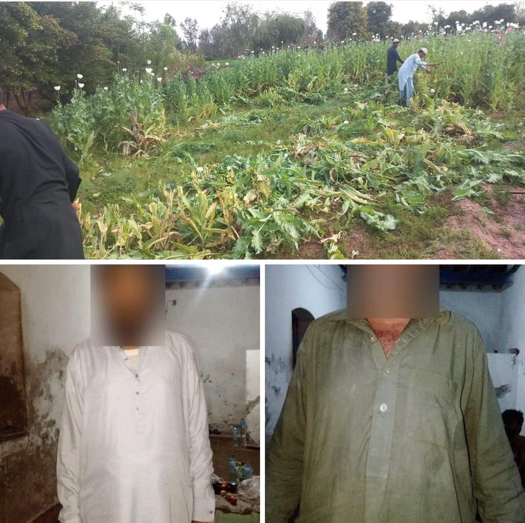 گرفتار دونوں ملزمان آپس میں بھائی ہیں، جنہوں نے متنی کے نواحی علاقہ اکاخیل سرہ خاورہ میں تقریباً 30 مرلہ زمین پر افیون کی فصل کاشت کی تھی۔