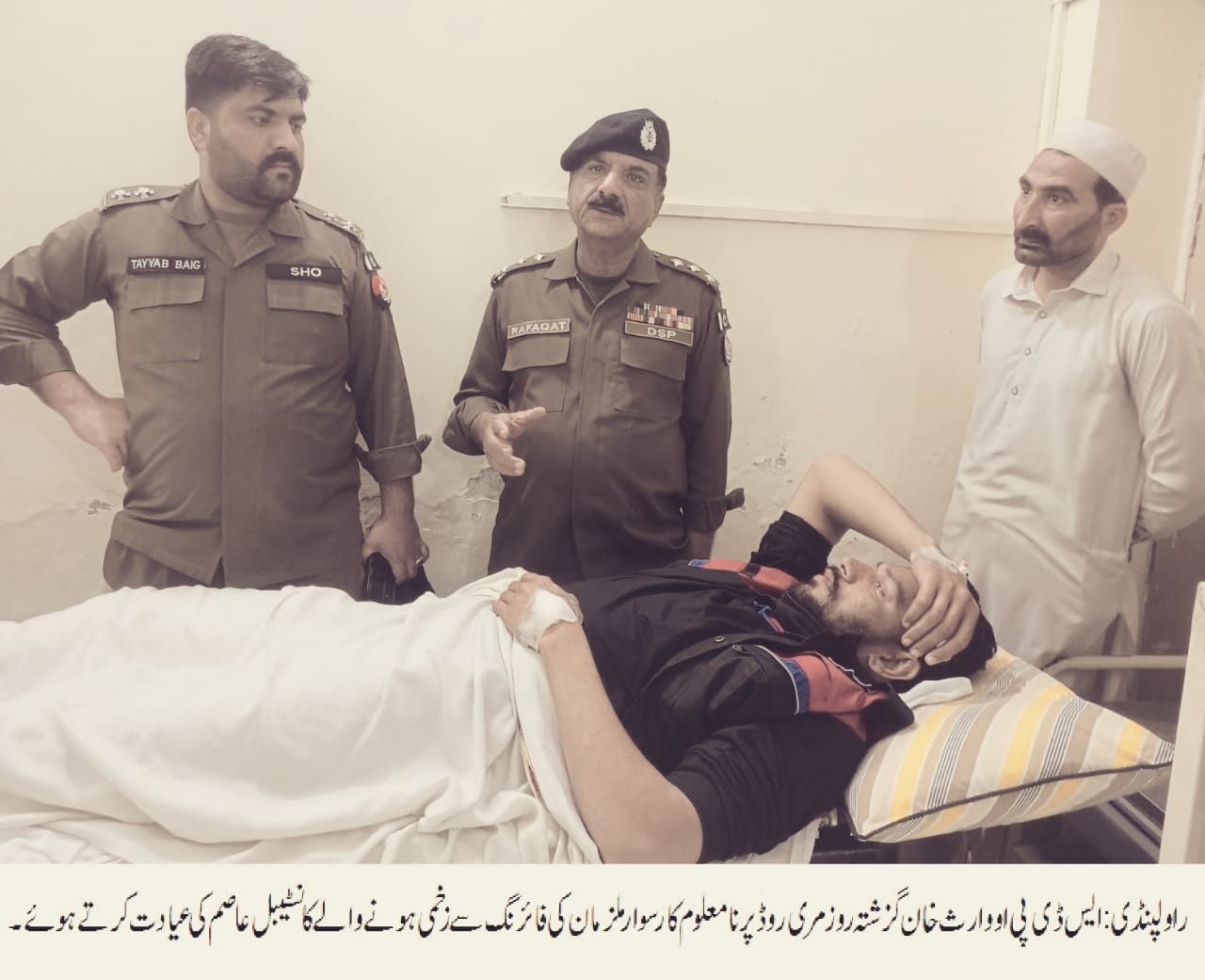 راولپنڈی(اردو ٹائمز) ایس ڈی پی او وارث خان ملک رفاقت حسین کی بی بی ایچ ہسپتال آمد،ایس ڈی پی او وارث خان مری روڈ پر نامعلوم کار سوار ملزمان کی فائرنگ سے زخمی ہونے والے کانسٹیبل عاصم کی عیادتراولپنڈی(سہ پہر) ایس ڈی پی او وارث خان ملک رفاقت حسین کی بی بی ایچ ہسپتال آمد،ایس ڈی پی او وارث خان مری روڈ پر نامعلوم کار سوار ملزمان کی فائرنگ سے زخمی ہونے والے کانسٹیبل عاصم کی عیادت
