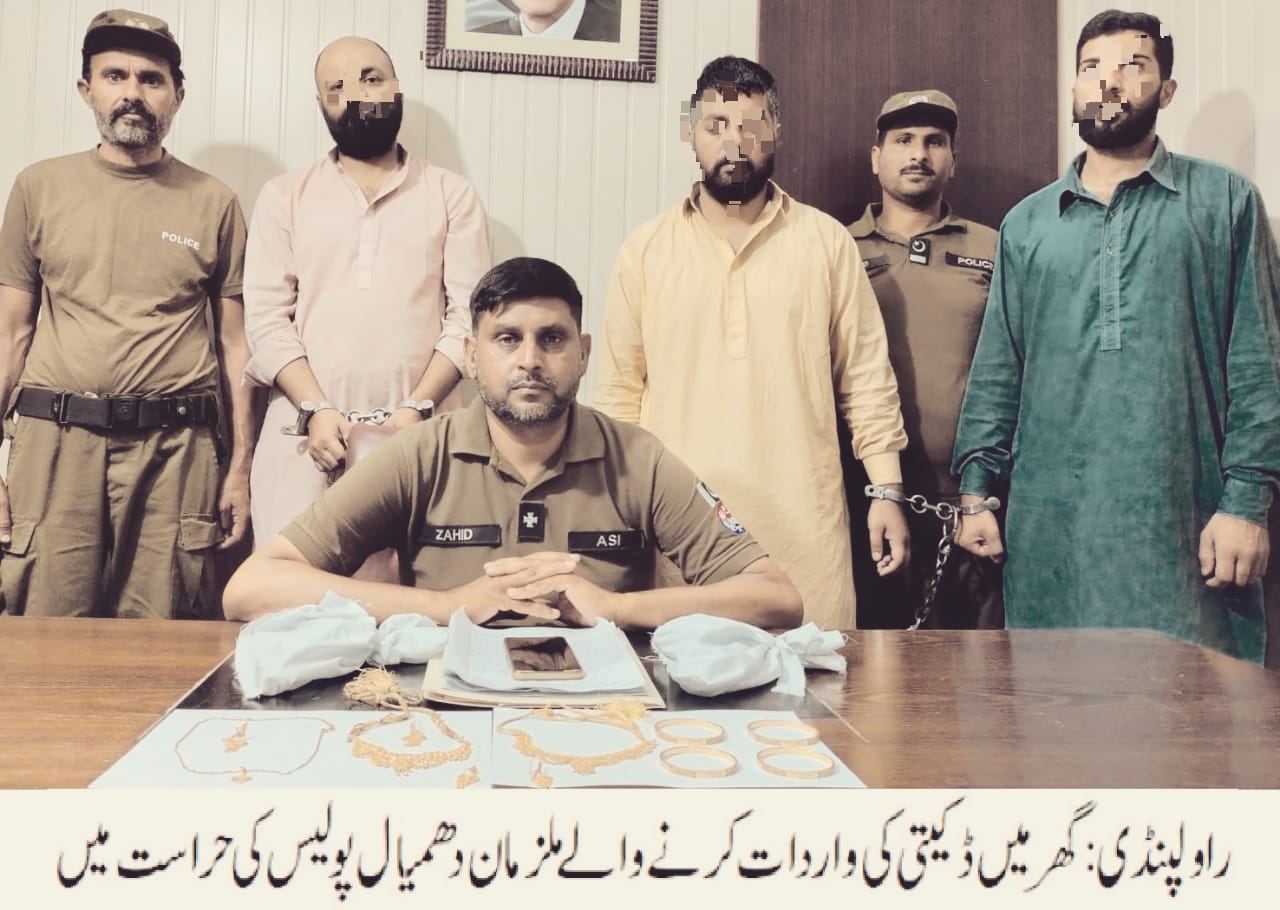 راولپنڈی(مظہر شاہ)ایس ایچ او تھانہ دھمیال کی زیرنگرانی زاہد محمود اے ایس آئی کی کاروائی، گھر میں ڈکیتی کی واردات کرنے والے وہاب گینگ کے 03 ملزمان گرفتار،14 تولے طلائی زیورات اور واردات میں استعمال ہونے والا اسلحہ برآمد۔تفصیلات کے مطابق ایس ایچ او دھمیال رانا کاشف کی زیرنگرانی زاہد محمود اے ایس آئی نے ہمراہ پولیس ٹیم کاروائی کرتے ہوئے گھر میں ڈکیتی کی واردات کرنے والے وہاب گینگ کے 03 ملزمان کو گرفتار کرلیا، گرفتار ملزمان میں وہاب، دانیال اورمبشر شامل ہیں، ملزمان سے 02 ہار سیٹ، 04 کڑے، 04 کانٹے اور 01 لاکٹ سیٹ اور واردات میں استعمال ہونے والا اسلحہ برآمد ہوا،ملزمان سے مال مسروقہ کی برآمدگی شناخت پریڈ کے بعد کی گئی،ایس پی صدر محمد نبیل کھوکھر نے دھمیال پولیس ٹیم کو شاباش دیتے ہوئے کہا کہ ملزمان کو ٹھوس شواہد کے ساتھ چالان عدالت کر کے قرار واقعی سزادلوائی جائے گی،شہریوں کی جان و مال پر حملہ کرنے والے قانون کی گرفت سے نہیں بچ سکتے۔