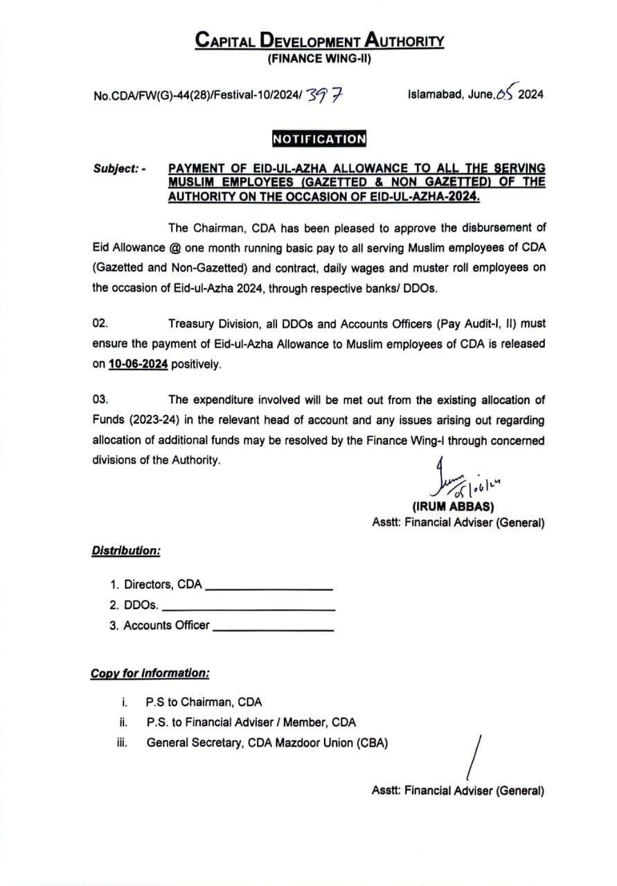 اسلام آباد(اردو ٹائمز) سی ڈی اے مزدور یونین (سی بی اے) کے ساتھ طے شدہ معاہدے کے تحت سی ڈی اے انتظامیہ نے ادارے میں کام کرنے والے تمام مسلم ملازمین کے لیے عیدالاضحیٰ الاؤنس کی منظوری دے دی