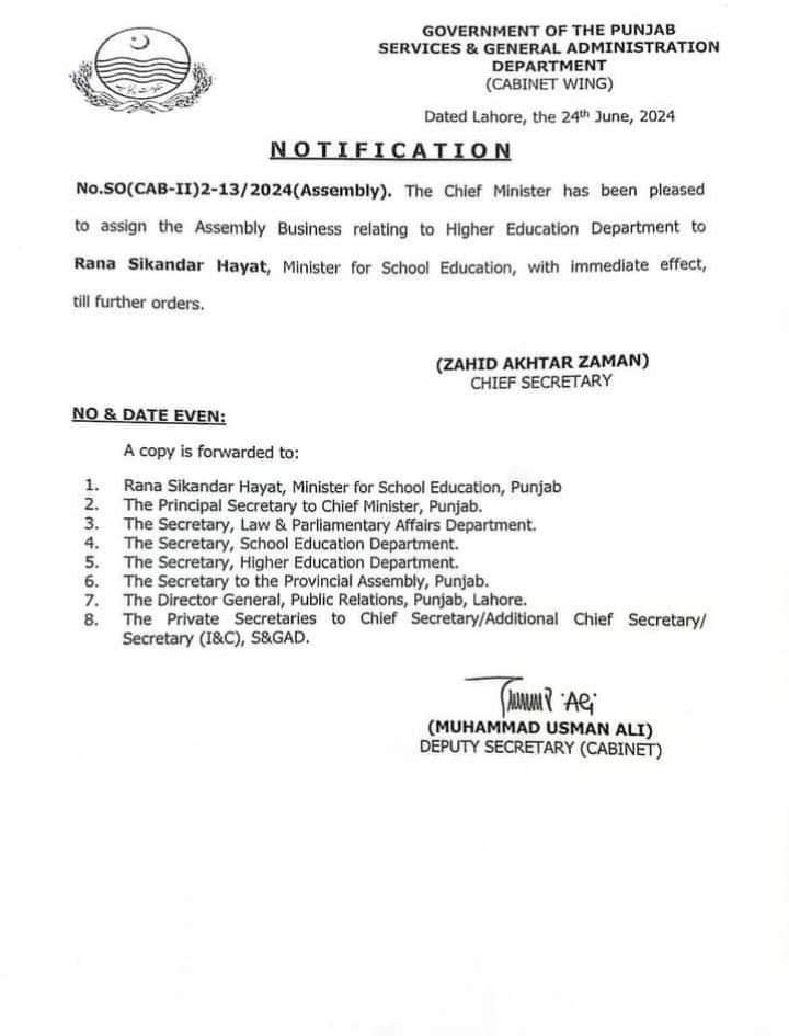 پاکستان لاہور (اردو ٹائمز) وزیر تعلیم پنجاب رانا سکندر حیات کو وزیر ہائر ایجوکیشن کا قلمدان بھی سونپ دیا گیا، نوٹیفیکیشن admin 2024-06-25 Share لاہور وزیر تعلیم پنجاب رانا سکندر حیات کو وزیر ہائر ایجوکیشن کا قلمدان بھی سونپ دیا گیا، نوٹیفیکیشن