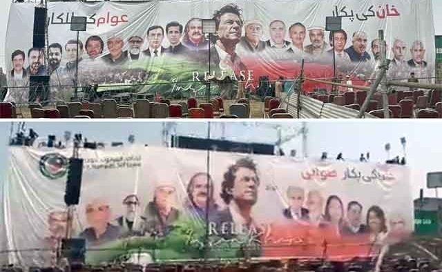 جلسے کے لیے کنٹینر پر لگائے گئے پہلے بینر پر 20 رہنماؤں کی تصاویر لگائی گئی تھیں، جس میں شاہ محمود قریشی اور مراد سعید کی تصاویر نہیں تھیں۔ بعد ازاں کارکنوں کے احتجاج اور شدید تنقید پر نئے بینر پر شاہ محمود قریشی سمیت 10 رہنماؤں کی تصاویر لگائی گئی ہیں۔