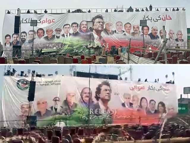 پاکستان تحریک انصاف (پی ٹی آئی) کے جلسے میں لگے مرکزی بینر پر شاہ محمود قریشی اور مراد سعید کی تصاویر نہیں لگائی گئیں، جس پر کارکن شش و پنج کا شکار ہو گئے۔
