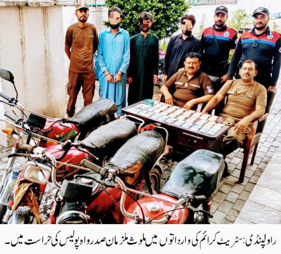 راولپنڈی(مظہر شاہ )ایس ایچ او تھانہ صدر واہ محسن شاہ کی ہمراہ پولیس ٹیم کاروائی، سٹریٹ کرائم کی وارداتوں میں ملوث یاسر گینگ کا سرغنہ 02 ساتھیوں سمیت گرفتار، چوری شدہ 04 موٹر سائیکل،مسروقہ رقم 95 ہزار روپے اور چھینے گئے 04 موبائل فون برآمد۔ تفصیلات کے مطابق حال ھی میں تعینات ہونے والے ایس ایچ او صدر واہ نے جرائم پیشہ عناصر کیخلاف کاروائیوں میں ہمراہ پولیس ٹیم کاروائی کرتے ہوئے سٹریٹ کرائم کی وارداتوں میں ملوث یاسر گینگ کے سرغنہ کو02 ساتھیوں سمیت گرفتارکر لیا،گرفتار ملزمان میں گینگ کا سرغنہ یاسر، ارشاد اور ارشد خان شامل ہیں، ملزمان سے چوری شدہ 04 موٹر سائیکل، مسروقہ رقم 95 ہزار روپے اور چھینے گئے 04 موبائل فون برآمد ہوئے، ملزمان سنیچنگ اور موٹرسائیکل چوری کے متعدد مقدمات میں ریکارڈ یافتہ ہیں،ایس پی پوٹھوہار ناصر نواز نے صدرواہ پولیس کو شاباش دیتے ہوئے کہا کہ ملزمان کو ٹھوس شواہد کے ساتھ چالان عدالت کرکے قرار واقعی سزا دلوائی جائے گی،شہریوں کو ان کے قیمتی اثاثے سے محروم کرنے والے ملزمان کے خلاف کاروائیاں جاری رکھی جائیں گی۔